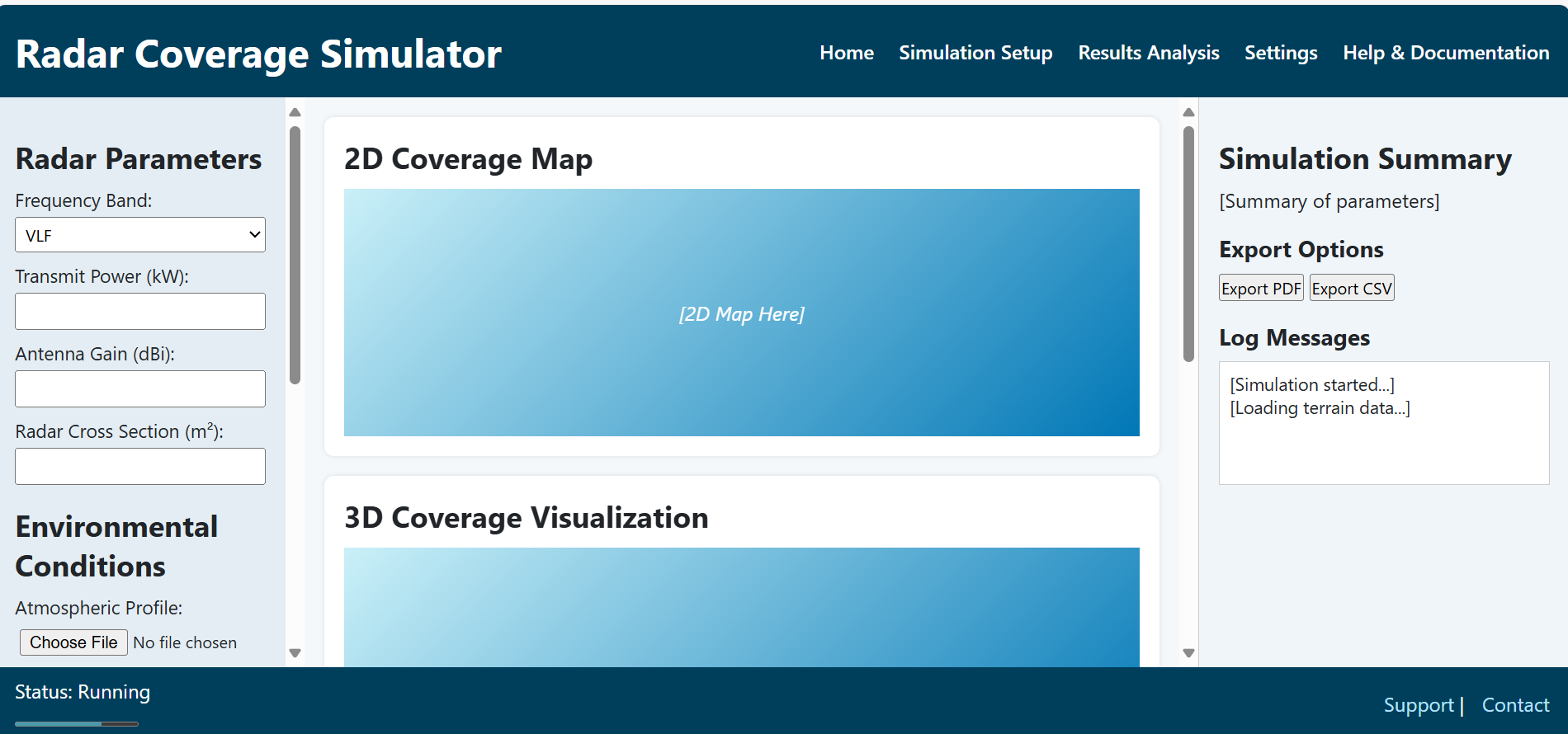 Real-time radar simulation tool with 2D and 3D visualization and data export capabilities.